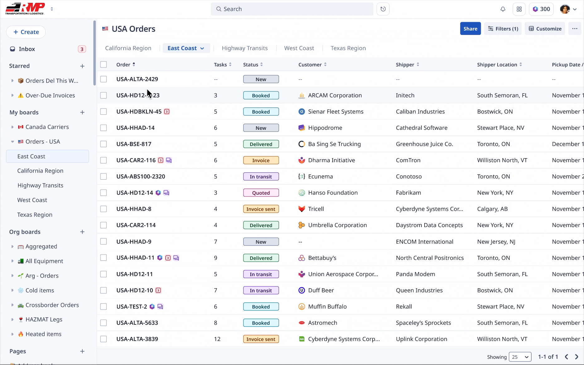 Configurable, shareable boards that let teams save views of orders with specific filters and columns, and hand off work when someone is out.